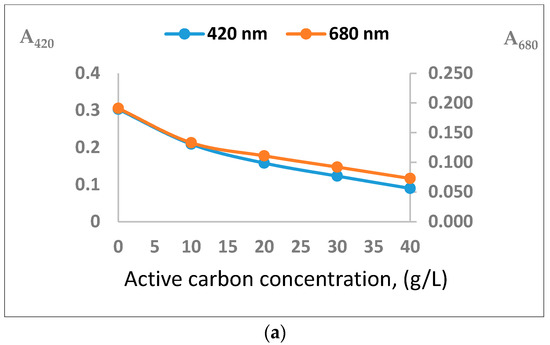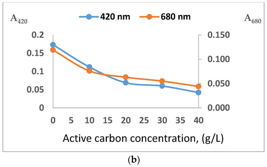 Optical density at 680 nm and 420 nm was determined to quantify the clarifying effect of the adsorption process with active carbon. Having in mind that the primary pigment involved in the process of photosynthesis is chlorophyll “a”—with strong absorption bands in the regions 400–450 and 650–700 nm [30], tests were conveyed for estimation of the adsorption spectrum at 420 and 680 nm for the anaerobic digestates—mesophilic (Figure 2a) and thermophilic (Figure 2b) in dependence of the quantity of applied active carbon.
