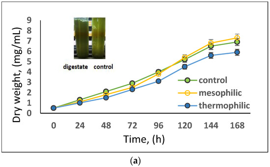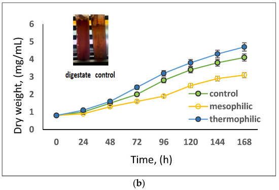 After clarification, both investigated strains were introduced once in a mesophilic digestate and then in a thermophilic digestate. Scenesdesmus acutus growth was highest—7.3 mg/mL in the mesophilic digestate, higher than growth in the control medium (Figure 3a). Porphyridium cruentum reached 4.7 mg/mL dry matter when grown in thermophilic digestate (Figure 3b).