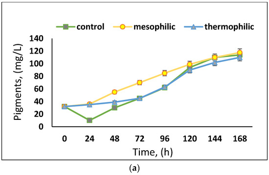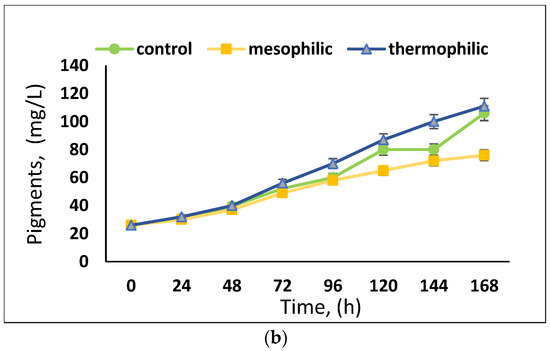 Microalgae productive chains are attracting attention as sustainable alternatives to obtain natural pigments [31]. Pigment content was evaluated to prove growth. Total amount of pigments of Scenedesmus acutus at the end of the process was 117 mg/L, which represents a 4-fold increase since the process has begun, showing good growth and pigment synthesis (Figure 4a). For Porphyridium cruentum the increase in pigments content was also proved to be about 4-fold since the process beginning (Figure 4b). According to the investigations of Fernandes et al., Chlorella vulgaris grew better on all three digestates tested in comparison to the F/2 control medium [32], which complies with the results obtained in this study.