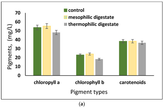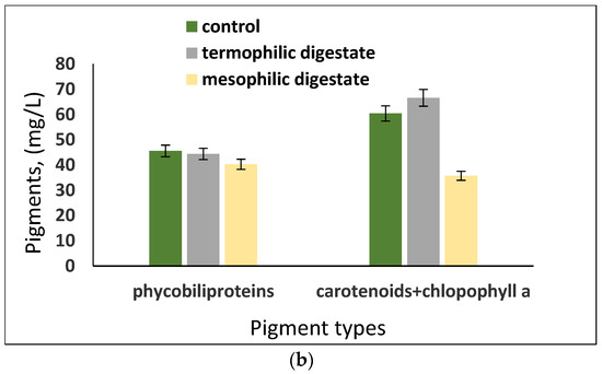 Indeed, digestate composition shows a vast potential to support microalgal growth, especially in terms of macronutrients, such as phosphorus and nitrogen, and together with remaining micronutrients in the right composition and ratio, it provided good development of algae with production of various products [33]. The characteristic pigments are presented for Scenedesmus acutus—chlorophyll a, chlorophyll b, and carotenoids (Figure 5a) and for Porphyridium cruentum—phycobiliproteins (PBP), carotenoids and chlorophyll a (Figure 5b).