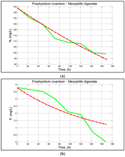 As a result of the performed parametric identification for the digestate from a mesophilic AD process and strain Porphyridium cruentum, the following optimal coefficients were obtained: , .