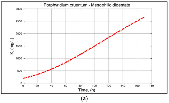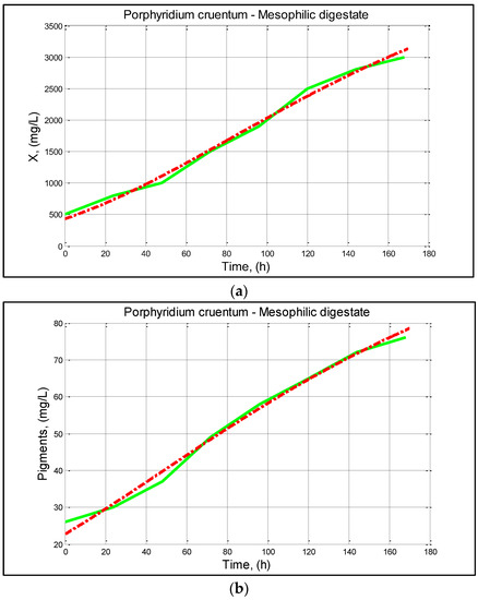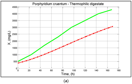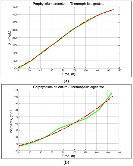 It was calculated that NRMSE for X is 10-fold greater and for Pigm—even more than 3-fold, when the obtained model for the digestate from termophilic AD process was applied. Finally, qualitatively and quantitatively, it could be concluded that the same model is not appropriate, and new coefficients are identified for this case.