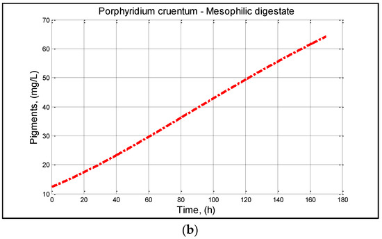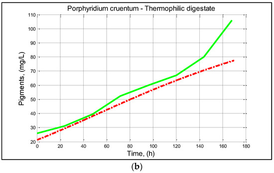 The value for NRMSE for the biomass in the thermophilic digestates is 0.0058 and for the pigments—0.0321. Qualitatively and quantitatively, the obtained coefficients are appropriate for the thermophilic case.