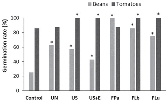 Effect of the rice bran (RB) additives to PGS on germination rate of bean and tomato seeds. Control, PGS; UN, untreated RB; US, ultrasonicated RB; US+E, ultrasonicated and enzyme-hydrolyzed RB; FPa, FLb, FLu, RB fermented with appropriate lactic acid bacteria strain. * significant at p < 0.05 compared to the controls.