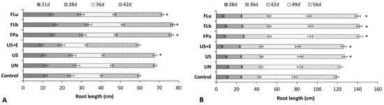 Influence of rice bran (RB) additives on bean (A) and tomato (B) root length. Control: PGS; PGS with RB: UN, untreated; US, ultrasonicated; US+E, ultrasonicated and enzyme-hydrolyzed; FPa, FLb, FLu, fermented with appropriate lactic acid bacteria strain. * significant at p < 0.05 compared to the controls.