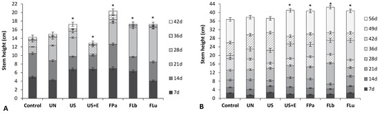 Influence of the rice bran (RB) additives on bean (A) and tomato (B) plant stem heights. Control: PGS; PGS with RB: UN, untreated; US, ultrasonicated; US+E, ultrasonicated and enzyme-hydrolyzed; FPa, FLb, FLu, fermented with appropriate lactic acid bacteria strain. * significant at p < 0.05 compared to the controls.