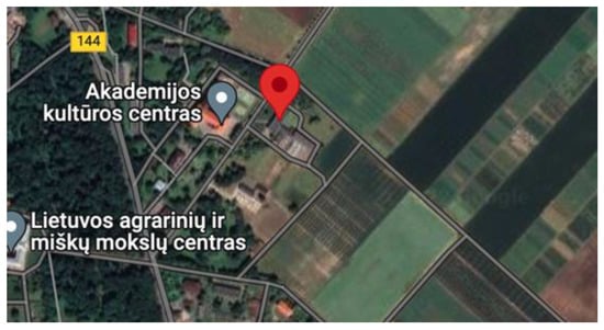 Purple wheat (pedigree of purple wheat lines: DS8526-2 (PS Karkulka/RGT Reform), DS8529-1 (PS Karkulka/Delawaro)) was grown in the experiment conditions given below. The field experiment was designed in 4 replications (plot size 11 × 1.6 m), each replicate was grown in a separate block, with the field plots’ arrangement randomised. The trials were conducted under intensive growing technology. The soil was light loam Endocalcari-Epihypogleyic-Cambisol. Topsoil (0–30 cm) pH is slightly alkaline (7.5), medium in humus (2.4%), high in available phosphorus (253 mg/kg P2O5), and moderate in available potassium (142 mg/kg K2O). Winter wheat was sown with treated seeds at a seed rate of 4.5 million/ha in the second part of September 2021 after the green-fallow. Complex mineral fertilisers (N24P66K136) were applied to the whole experimental field before sowing. Nitrogen fertilisers (ammonium nitrate) were applied after resumption of spring vegetation (on 19 of April 2022) and when plants reached the stem elongation stage (on 16th May 2022). The rate of N100+60 was used. Weeds were controlled using the recommended herbicides in the autumn and spring. Yield was harvested on 4 August. The elevation of the experimental area is 82 m above sea level, and it belongs to the mid-latitude climate zone in the southwestern subregion of the Atlantic continental forest area. According to data from the local Dotnuva Meteorological Station (55°23′49.0″ N 23°51′55.0″ E, Figure 1), the climatic conditions were characterized by a long-term (1924–2022) average annual temperature of 6.5 °C and precipitation of 570 mm. The autumn of 2021 was slightly warmer (0.7 °C) and dryer than usual. The winters were quite mild, crop damage was very low. Spring–summer vegetation periods were cooler (1.3 °C) and very rainy (double precipitation rate). Very heavy rains partially washed away nitrogen and sulphur, thereby worsening the nutrition of plants. As well, plants roots were stressed by air deficiency in soil due to constantly wet soils. Wheat grain yield and quality were lower than usual in the rainy vegetation period.
