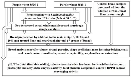The WB formula consisted of 1 kg of wheat flour, 1.5% salt, 3% fresh compressed yeast, and 600 mL water (control bread). Control WB samples were prepared without the addition of purple wheat flour or sourdough. The tested sample groups were prepared by addition of 5, 10, 15, or 20% non-treated purple wheat flour and sourdough to the main recipe. In total 18 groups of dough and bread samples were prepared and tested. The dough was mixed for 3 min at a low speed, then for 7 min at high speed in a dough mixer (KitchenAid Artisan, Greenville, OH, USA). Then, the dough was left at 22 ± 2 °C for 10 min relaxation. After, the dough was shaped into 425 g loaves, formed, and proofed at 30 ± 2 °C and 80% relative humidity for 60 min. The bread was baked in a deck oven (EKA, Borgoricco PD, Italy) at 220 °C for 25 min. The principle scheme of the experiment is shown in Figure 2.