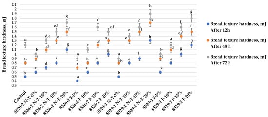 After 48 h of storage, most of the samples showed higher hardness in comparison with control breads, except for 8526-2 F-5%, whose hardness was, on average, 12.5% lower, and 8526-2 F-10% and 8529-1 N-T-5%, whose hardness did not differ from the control value of 0.8 mJ.