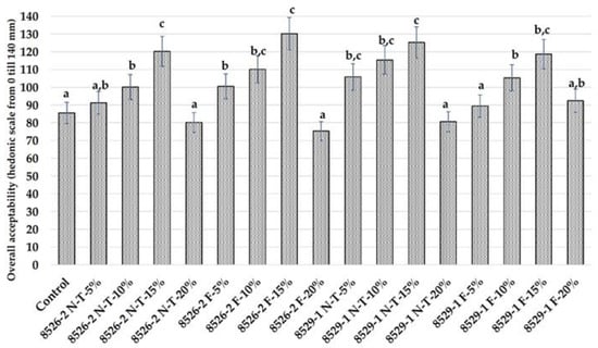 Bread overall acceptability (Control—bread prepared without purple wheat flour or sourdough; NT—bread with non-treated purple wheat flour; F—bread with purple wheat flour sourdough. 5%, 10%, 15%—bread prepared with 5%, 10%, 15%, respectively, non-treated purple wheat flour or sourdough. Data are expressed as mean values (n = 10) ± standard error (SE). a–c Mean values within all samples with different letters are significantly different (p ≤ 0.05)).