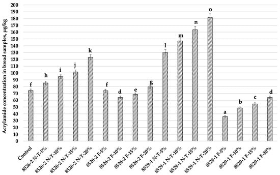 Acrylamide concentration (µg/kg) in bread samples (8526-2 N-T—8526-2 non-treated purple wheat; 8526-2 F—8526-2 purple wheat fermented with L. plantarum No. 135 strain; 8529-1 N-T—8529-1 non-treated purple wheat; 8529-1 F—purple wheat fermented with L. plantarum No. 135 strain; Control—bread prepared without purple wheat flour or sourdough; NT—bread with non-treated purple wheat flour; F—bread with purple wheat flour sourdough. 5%, 10%, 15%—bread prepared with 5%, 10%, 15%, respectively, non-treated purple wheat flour or sourdough. Data are expressed as mean values (n = 3) ± standard error (SE). a–o Mean values with different letters are significantly different (p ≤ 0.05).
