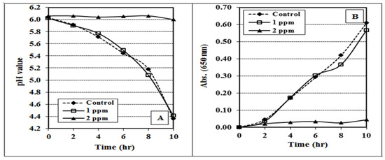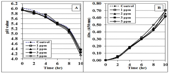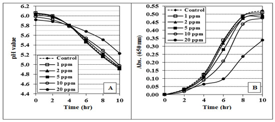 The effect of 1, 2, 5, 10, and 20 ppm of Cr (CrPi) on the growth of yoghurt starter culture in MRS media for 10 h was indicated by the absorbance and acidity development (pH) medium as shown in Figure 3A,B, respectively.