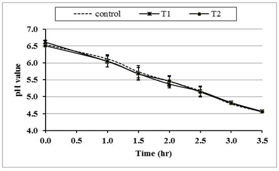 Effect of different concentrations of CrPi on the pH of the media during yoghurt fermentation. Control: without Cr (CrPi), T1: with 0.25 ppm Cr (CrPi), T2: fortified with 0.5 ppm Cr (CrPi). The data are shown as mean ± SE for three replicates.