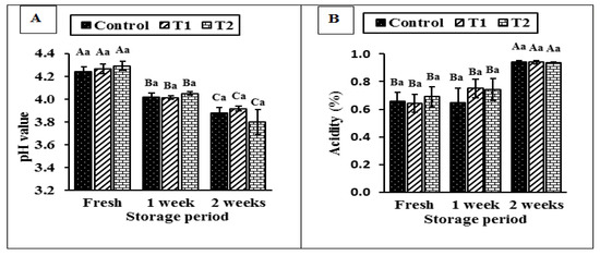 Figure 5 shows the effect of the storage period on the acidity development of CrPi-fortified yoghurt. The pH values (Figure 5A) did not differ significantly due to the applied treatments (T1 or T2), whether they were fresh or cold-stored for up to 2 weeks. Meanwhile, the pH values of all groups decreased significantly during storage. Consistent with these results (Figure 5B), all the tested fresh samples had almost the same acidity values (p > 0.05), while those stored in the cold for a week showed a slight increase (p > 0.05) in acidity. Whereas the acidity significantly increased by increasing the storage period of the yoghurt samples to 2 weeks without any significant differences among the treatments. Previous studies have also reported an increase in the acidity of the yoghurt during storage [51,52], which then decreases during the storage period [53].