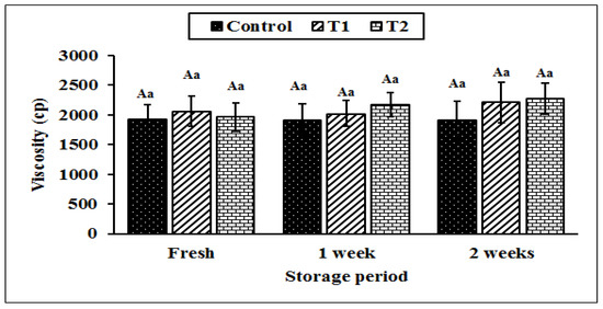 The effect of different concentrations of chromium (CrPic) on the viscosity of yoghurt during storage. Control without Cr (CrPi), T1 with 0.25 ppm Cr (CrPi), T2 fortified with 0.5 ppm Cr (CrPi). Data are mean ± SE for three replicates. Means with different small letters are significantly different between the treatments (p ≤ 0.05). Means with different capital letters significantly differ between the storage periods (p ≤ 0.05).