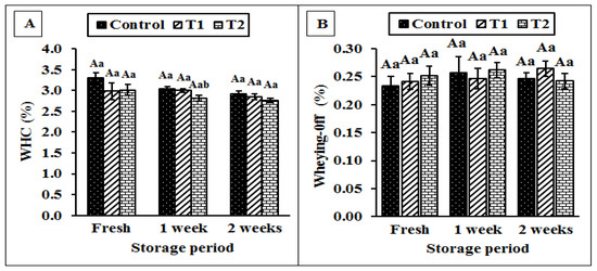 Figure 8A,B show the WHC and wheying-off, respectively, of the yoghurt treated with or without Cr (CrPi). The results revealed no significant difference in the percentage of WHC and wheying-off of the fresh and cold-stored yoghurt in the treated samples. Moreover, the storage period had no significant effect on both properties.