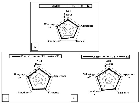 Effect of chromium (CrPic) on the sensory properties of fortified yoghurt when fresh (A) and after cold storage for a week (B) and 2 weeks (C). Control: without Cr (CrPi), T1: with 0.25 ppm Cr (CrPi), T2: fortified with 0.5 ppm Cr (CrPi). Data are shown as the mean of three replicates.