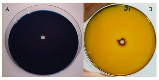 Acid-production zone of Y. lipolytica NRRL Y-1094 ((A): day 0 and (B): day 6).