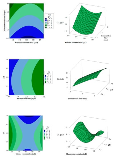 Table 5 shows the results of the ANOVA and estimated regression-coefficients for CA production. The negative coefficient for pH and initial substrate-concentration showed that the CA concentration decreased with increasing initial-pH and substrate-concentration (p < 0.05). The smaller p-value indicated that the correlation for the coefficient was more important. The fermentation time had the highest impact on the CA production, considering the highest linear-coefficient (8.321), followed by the substrate concentration (−1.707) and pH level (−1.020), respectively. Moreover, the initial pH value and the fermentation time had a significant negative quadratic-effect on CA production (p < 0.05), indicating that the CA concentration of these factors increased and decreased as the level of these parameters increased above certain values. The interaction between the substrate concentration and fermentation time was significant (p < 0.05).