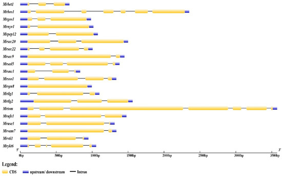 Exon–intron structure of MrSNAREs. Blue boxes represent upstream and downstream untranslated regions; yellow boxes represent the CDS; and black lines represent the introns.