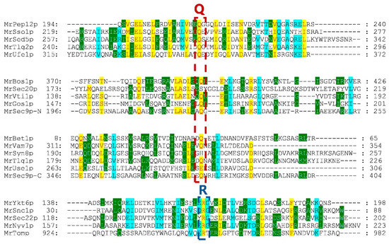 Identification of conserved residues of MrSNAREs. Red dotted boxes represent the conserved glutamine residue (Q), blue dotted boxes represent the conserved arginine residue (R).
