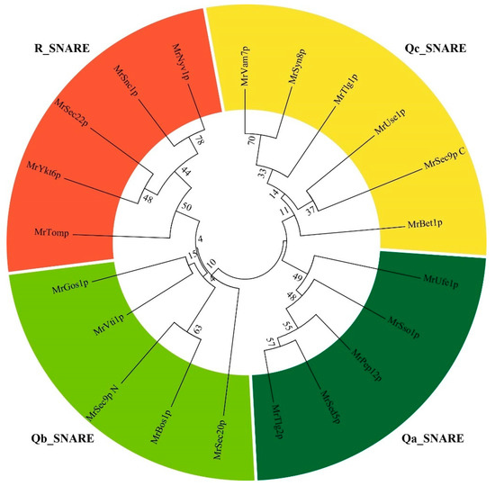 The conserved domains of MrSNAREs were analyzed, and the results showed that the MrSNAREs were mainly classified as Qa-, Qb-, Qc- and R-SNAREs (Figure 2). In detail, Qa-SNAREs were composed of five members (MrSso1p, MrPep12p, MrSed5p, MrTlg2p and MrUfe1p), which belonged to syntaxin proteins; Qb-SNAREs were composed of five members (MrBos1p, MrGos1p, MrVti1p, MrSec20p and MrSec9N), which belonged to SNAP-25 N-terminal motif homologous proteins; Qc-SNAREs were composed of five members (MrBet1p, MrSyn8p, MrTlg1p, MrUse1p and MrSec9C), which belonged to SNAP-25 C-terminal motif homologous proteins; and R-SNAREs were composed of five members (MrSnc1p, MrSec22p, MrNyv1p, MrYkt6p and MrTomp), which belonged to synaptobrevin proteins (Figure 2). Ordinarily, the glutamine residues were highly conserved among most Qa-SNAREs, and the arginine residues were highly conserved among all R-SNAREs (Figure 3), while the glutamine residues of one Qb-SNARE (MrSec20p) and two Qc-SNAREs (MrSyn8p and MrUse1p) were replaced by serine (S), histidine (H) or glutamic acid (E) (Figure 3). In addition, phylogenetic analysis indicated that the SNAREs displayed the same four categories described previously (Figure 4). Consistent with the results of multiple sequence alignment, this verifies the conservation and typicality of MrSNAREs.