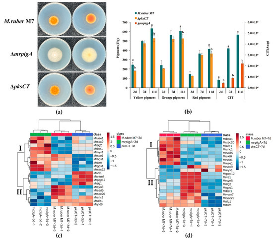 Firstly, the phenotypic characterization and main secondary metabolite production of the wildtype and two mutants, ΔpksCT and ΔmrpigA, were compared. After being cultured on PDA medium for 7 days, the colony color and size of M. ruber M7 and ΔpksCT were similar, but the colony of ΔmrpigA turned from orange to white, and the colony size was obviously larger than that of M. ruber M7 (Figure 6a). Figure 6b shows that ΔmrpigA had no MPs and lower CIT yield compared with M. ruber M7; correspondingly, ΔpksCT had no CIT and lower MPs yield compared with M. ruber M7. For example, the content of CIT in ΔmrpigA was about 45% of that in M. ruber M7, and the contents of YP, OP and RP in ΔpksCT were about 83, 86 and 87% of that in M. ruber M7 on the 11th day. These results confirmed the remarkable differences in the secondary metabolite types of the three tested strains.