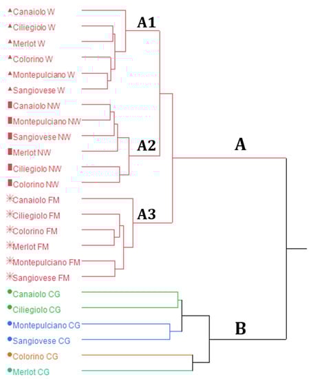 The dendrogram of the HCA (Figure 1) shows a sharp tendency of the samples to gather in clusters based on the vinification phase they belong to. In the dendrogram, two macro-clusters, A and B, can be identified. The first one (A) comprises all the samples obtained after the crushing of grapes, once the fermentation has started (FM, NW and W), whilst the second one (B) is composed of the CG samples. In the macro-cluster A, three sub-clusters are evidenced in the dendrogram: A1 groups comprises the W samples, A2 comprises the NW samples and A3 is composed of the FM samples. It is noteworthy that the FM samples, which represent the first fermentation phase at the beginning of the vinification process, are clustered right next to the CG samples of macro-cluster B. The NW samples are grouped between the FM and the W samples. This clustering behaviour sharply reproduces the order in which the vinification process occurred.
