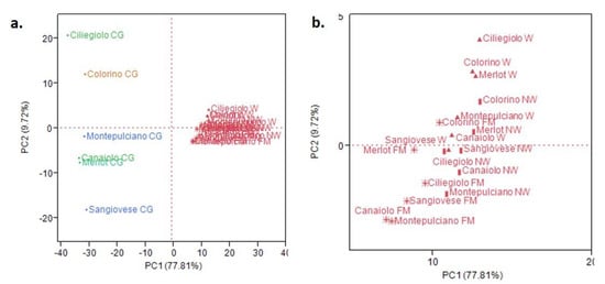 These results were confirmed by the principal component analysis. As shown in Figure 2a, the CG samples for all the cultivars are plotted in the left quadrants, thus showing negative loadings on the PC1 axis. ‘Ciliegiolo’ and ‘Colorino’ CG samples are plotted in the upper left quadrant of the PCA, with positive PC2 loading. 1-hexanol (11) is the reason for this positioning, as it is quite abundant in both the samples, as can be observed in the loadings plot (Figure S1, Supplementary Material). The CG samples of the other cultivars are all plotted in the bottom left quadrant, with negative PC2 loading. ‘Montepulciano’ cultivar is the upper one, due to the quantitatively relevant presence of (E)-3-hexenol (10) and 1,8-cineole (32) in its headspace (Figure S1, Supplementary Material). ‘Canaiolo’, ‘Merlot’ and ‘Sangiovese’ cultivars, instead, all show significant relative abundances of (E)-2-hexenal (9) and hexanal (7), two non-terpene aldehydes which are the reason for this plotting (Figure S1, Supplementary Material). All the other samples for all the cultivars are plotted in the right quadrants, thus with positive loadings on the PC1 axis. In the bottom area of the upper quadrant, with positive loading on the PC2 axis, the samples with a significant relative abundance of ethanol (2) and isoamyl alcohol (4) in their headspace are plotted (Figure S1, Supplementary Material). In the upper section of the bottom right quadrant, thus with negative loading on the PC2 axis, ethyl esters, such as compounds 23 and 61, together with phenyl ethyl alcohol (44), are the reason for the plotting of the other samples in this area (Figure S1, Supplementary Material).