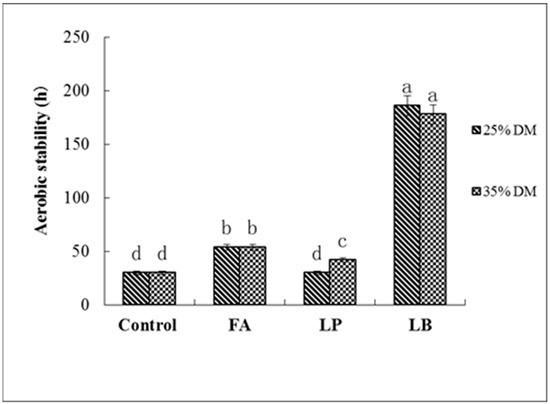 Untreated groups at both DM contents were started having a fever after 30 h of exposure to air (Figure 1). Treatments with LB significantly improved (p < 0.05) the aerobic stability to more than 170 h for both DM contents, and the LP-treated groups were not bad throughout the 42 h period of monitoring for both DM contents. The FA-treated groups were found to be stable for 54 h.