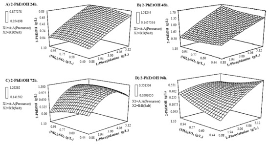 The production of 2-PhEtOH at 72 and 96 h (Figure 1C,D), shows graphs corresponding to a second-order model, which allows to observe a maximum response within the study region. Table 4 shows the maximum aroma concentration, as well as the combination of precursor and salt necessary to achieve it. The 48 and 72 h stand out, because it obtained the maximum concentration of 2-PhEtOH, the values were 1.25 and 1.17 g/L, respectively. It has been reported that working with 1 g/L of L-phenylalanine and 0.45 g/L of (NH4)2SO4, aroma production values of 0.78 g/L at 96 h will obtained [24]. Under these conditions, it can see that the applied treatments improve the fermentation time, the main objective of optimizing a process. Some authors suggest considering the ethanol production; 2-PhEtOH and ethanol show a synergistic effect, inhibiting yeast proliferation, recommending avoiding the accumulation of both during the fermentation process [7,19,27]. The last can be disregarded due to Crabtree effect in K. Marxianus. Recently, [28] concluded that under micro-aeration conditions and a high content of carbon source (inulin) the production of ethyl alcohol could be favored. For this reason, it is intuited that the system of this study follows this way. Therefore, it is suggested to carry out new studies considering aeration as variables.