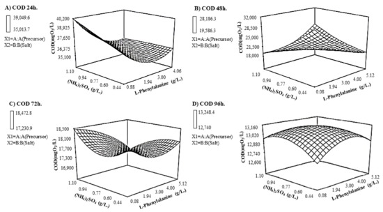 COD response surface, at the different fermentation times, where (A) 24 h, (B) 48 h, (C) 72 h and (D) 96 h.