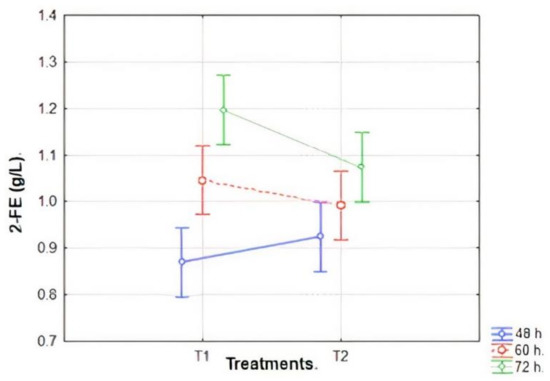 The mean comparison graph (Figure 3), shows that treatment 1 (T1) produces the lower amount of 2-PhEtOH, under the conditions predicted by the model, while at 60 h the yeast produces approximately 1 g/L and at 72 h it produces 1.2 g/L. Whereas treatment T2 produces a greater metabolite concentration at 48 h. Although a large increase in production is not observed with respect to 60 and 72 h, with a production of 1.08 g/L. The aroma concentration is like the aforementioned results, for which the use of the obtained models is recommended to predict future responses.
