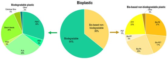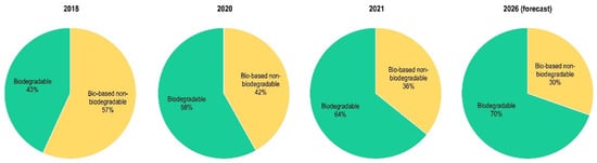 According to the latest forecast from the nova-Institute [22], PBAT is likely to quadruple during the next 5 years, while PBS will also show a significant growth. The bio-based non-biodegradable plastics, including the drop-ins (such as bio-polyethylene (bio-PE), bio-polypropylene (bio-PP), bio-polyethylene terephthalate (bio-PET), bio-polyamides (bio-PA), and bio-polyurethanes (bio-PU)), PEF, and poly(trimethyleneterephthalate) (PTT) constitute a significant percentage of the bio-plastic market (around 36% in 2021). It is worth noting that only three years before, the nova-Institute report (2018) presented the opposite situation, with the majority of the bioplastics coming from non-degradable polymers (56.8%), thus showing a new interesting trend towards more biodegradable solutions (Figure 3).
