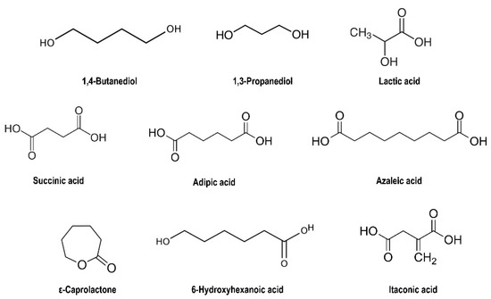 Azelaic acid or nonanedioic acid is an -dicarboxylic acid with nine carbons. It has been recently reported as a valuable bio-based monomer for biodegradable polymers; for example, azelaic acid-based polyesters, terpolymer containing azelaic acid, and polyamide containing azelaic acid [172]. An example of an azelaic acid-based polymer is poly(ethylene azelate) which showed to be biodegradable at a comparable rate with poly--caprolactone [173]. The azelaic acid market is predicted to reach 160 million USD by 2023 [172].