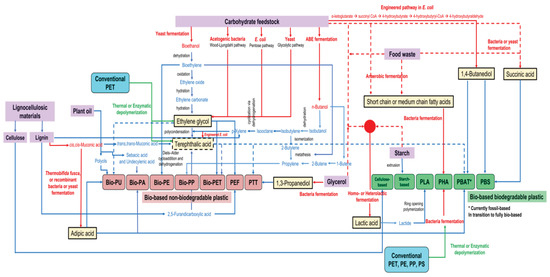 The current advance in metabolic and bioprocess engineering allows several plastic building blocks to be produced (Figure 4) by microbial fermentation from renewable resources. In Figure 5, an overview of current processes for plastic production from bio-based building blocks is illustrated. A more detailed description is provided in the following sub-section.