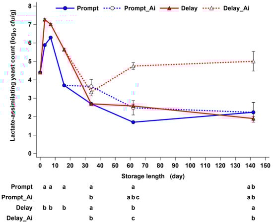 Changes in the concentration of lactate-assimilating yeasts during the fermentation of maize silage as affected by sealing time and repeated air ingress during 142 days of storage. Least square means are presented with standard error of means as error bars, significant differences within respective storage length are given below as plot table (a–c: means with no common letter differ at p < 0.05; pairwise comparisons by rank procedure). Prompt, promptly sealed, without air ingress during storage; Prompt_Ai, promptly sealed with air ingress after 27, 55, 135 days of storage; Delay, sealed with 24 h delay, without air ingress during storage; Delay_ Ai, sealed with 24 h delay and air ingress after 27, 55, 135 days of storage.