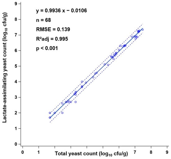 Based on linear regression analysis (Figure 2), total yeast count was almost exclusively composed of lactate-assimilating species (R2 = 0.995; p < 0.001).