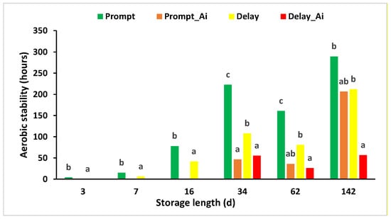 Aerobic stability during the course of fermentation of maize silage as affected by sealing time and repeated air ingress during storage of maize silage over 142 days. Least square means are presented with standard error of means as error bars, significant differences within respective storage length are given below as plot table (a–c: means with no common letter differ at p < 0.05; pairwise comparisons by rank procedure). Prompt, promptly sealed, without air ingress during storage; Prompt_Ai, promptly sealed with air ingress after 27, 55, 135 days of storage; Delay, sealed with 24 h delay, without air ingress during storage; Delay_ Ai, sealed with 24 h delay and air ingress after 27, 55, 135 days of storage.