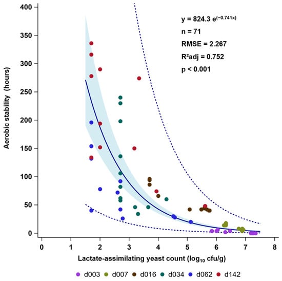 Despite differences between sealing time, aerobic stability (ASTA) was always below two days during the first week of storage (Figure 3). Thereafter, ASTA increased in promptly sealed silages without air until the end of fermentation. Throughout storage, silage sealed with delay and repeated air ingress showed the lowest ASTA. A strong exponential relationship was found between the count of LAY and ASTA (Figure 4, R2 = 0.752, p < 0.001).