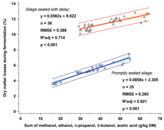 The DM losses in our study were strongly correlated with intensive yeast activity, alcohol and acetic acid formation [1], in both sealing time treatments (Figure 6, R2 = 0.71, p < 0.001; R2 = 0.92, p < 0.001). Assuming that the intercept with the y-axis (sum of alcohols and acetic acid) represents the unavoidable fermentation loss due to CO2 production under strictly anaerobic conditions (2–4% according to Zimmer [43]), here 2.3% in promptly sealed silage, the mean difference for those sealed with a delay is 6.7%, or a fourfold higher fermentation loss due to delayed sealing. According to McDonald et al. [1] and Rooke and Hatfield [33], DM losses are generally much higher when bacteria other than lactic acid bacteria play a dominant role in fermentation. The present results confirmed the importance of immediate air exclusion to safely prevent intensive aerobic conversion processes during the first days of storage. Brüning et al. [44] also found in their experiments with maize that a delay of sealing by four days resulted in similar fermentation losses of up to 11%. This data clearly showed that any undesired fermentation processes that generate CO2 must be suppressed to maintain the highest DM recovery possible.