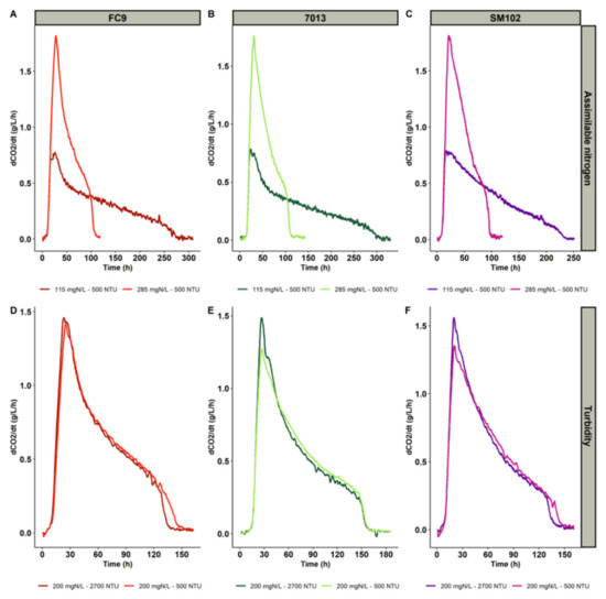 The impact of assimilable nitrogen concentration in the must (A–C) and turbidity (D–F) on fermentation kinetics at 23 °C for three yeast strains: FC9® (A,D), 7013® (B,E) and SM102® (C,F).
