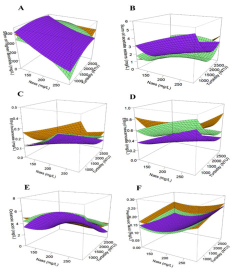 where and represent the coded values of the initial nitrogen content and turbidity, respectively, is the predicted response, is the intercept term, is the linear coefficient, is the quadratic coefficient and is the interaction coefficient. When necessary, a simplified model was fitted for some compounds by suppressing the interactive terms of the equation according to validity criteria.