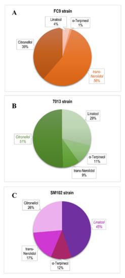 The distribution of terpene synthesis for strain (A) FC9® (―), (B) 7013® (―) and (C) SM102® (―), including all fermentative conditions.