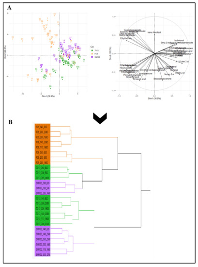 Principal component analysis of aroma production (fermentative aromas, terpenes, aldehydes, noriseprenoids and alcohols) for the three strains (FC9® (―), 7013® (―) and SM102® (―) under all conditions of fermentation (A) and its correlation with the hierarchical classification of the aromatic composition of wines (B).