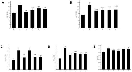 Comparative analysis of the serum biochemical indices in mice with acute alcoholic liver injury. (A) serum AST levels; (B) serum ALT levels; (C) serum TG levels; (D) serum TC levels; (E) serum ADH levels. Mice were divided into the following categories: N—normal group; M—model group; P—positive group; U—unfermented group; H—fermented high-dose group; L—fermented low-dose group. n = 10. Statistical significance is marked as follows: * represents the significant difference between each experimental group and the N group with p < 0.05, ** represents p < 0.01; ## represents the significant difference between each experimental group and the M group with p < 0.01.