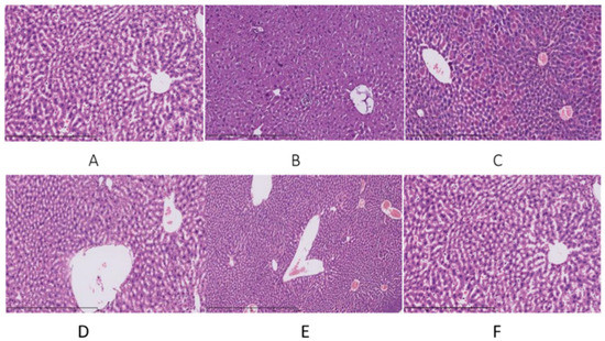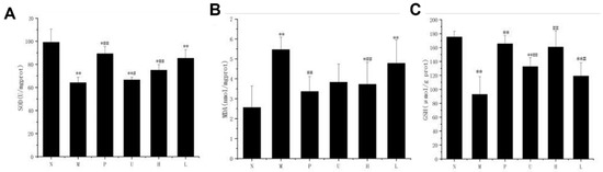 A small portion of liver tissue was mixed with a nine-fold amount of phosphate buffer solution (PBS) in an ice bath to prepare a 10% tissue homogenate. The homogenate was centrifuged at 12,000 rpm at 4 °C for 15 min, and the supernatant was used for MDA, GSH, and superoxide dismutase (SOD) assays, according to the corresponding kits (Nanjing Jiancheng Bioengineering Institute, China). The pathology of the liver was analyzed using the tissue section method. Briefly, the liver tissue was fixed in 10% neutral buffered formalin for 24 h. Paraffin blocks embedded with the liver tissues were cut into 5 μm thick sections and stained with Hematoxylin−Eosin (HE), as previously reported [19]. The sections were observed under a light microscope (Olympus, Shinjuku, Japan).