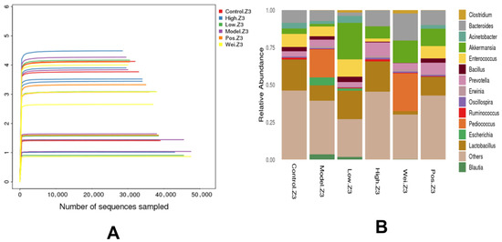 (A) The Shannon-Wiener index curve. (B) The horizontal abundance map of the intestinal microbiota in mice.