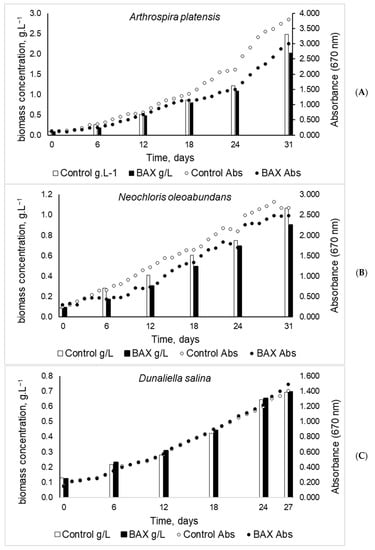 3.3. Cultivation of A. platensis, N. oleoabundans, and D. salina on BAX Medium