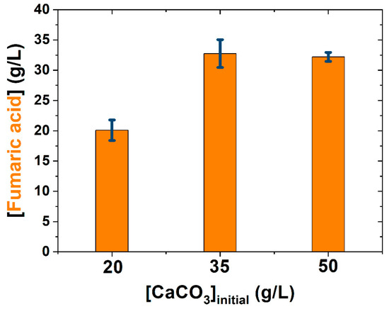 It can be seen how a moderate reduction of CaCO3 composition (from 50 to 35 g/L) led to a similar fumaric acid concentration, even if a decrease of 15 g/L was performed, while the creation of solid deposits was avoided (Figure 1). At the same time, the pH decrease was slow during the process, only reaching pH values lower than 5 at the last hours of the process due to the high fumaric acid concentrations reached.